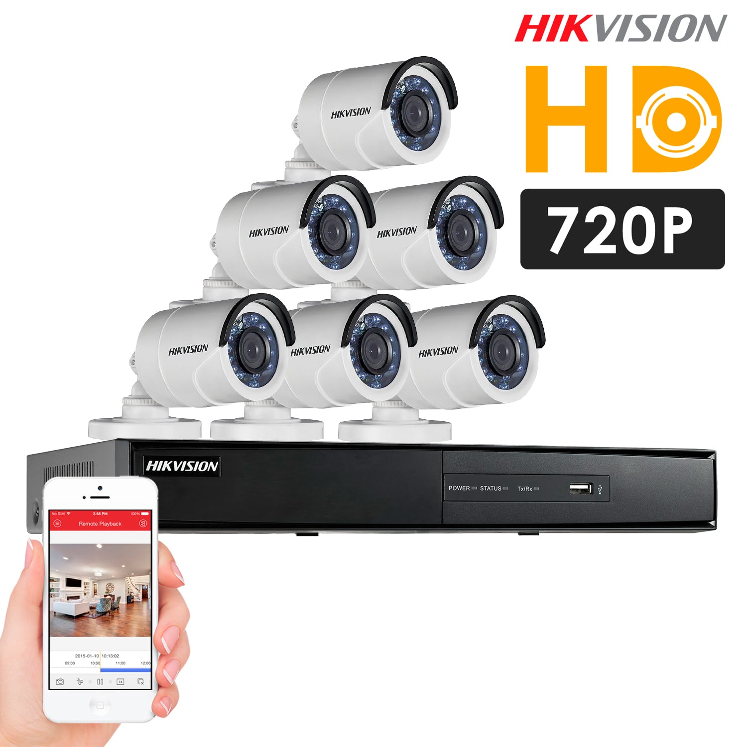 Cámara de seguridad – HikVision KIT HD con 6 cámaras HD 720p tipo tubo con infrarrojo para vista en oscuridad, disco duro de 1Tb (1000GB) para grabación, DVR 8 canales (soporta hasta 8 cámaras), y accesorios para la instalación. Puede visualizar las cámaras en tiempo real, ver las grabaciones, y descargar fácilmente los videos para tener copias de seguridad.